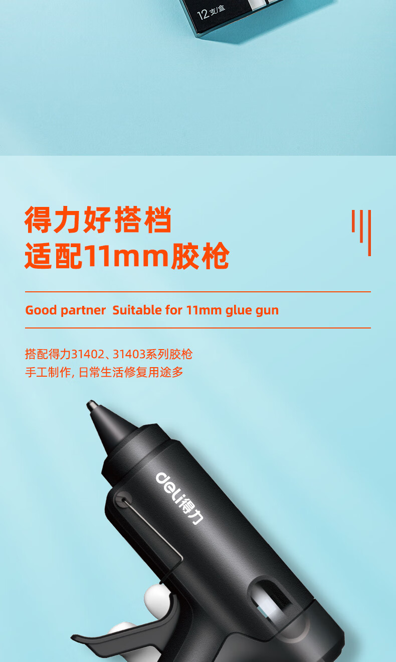 商品名称:得力(deli)12根热熔胶棒11mm×15cm 大号款适用 儿童家用手工制作热胶枪热融胶棒φ7mm 31406