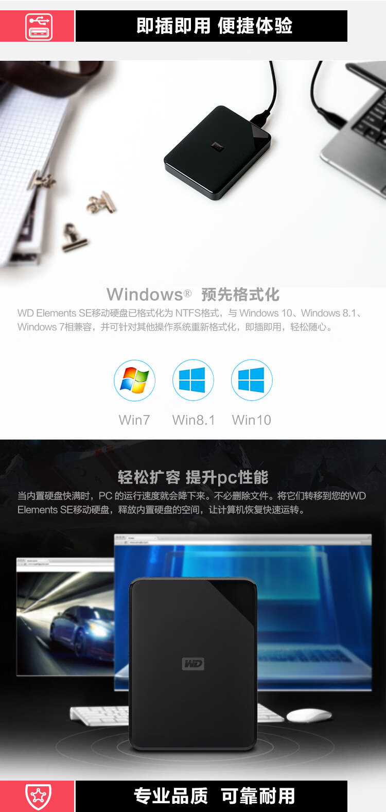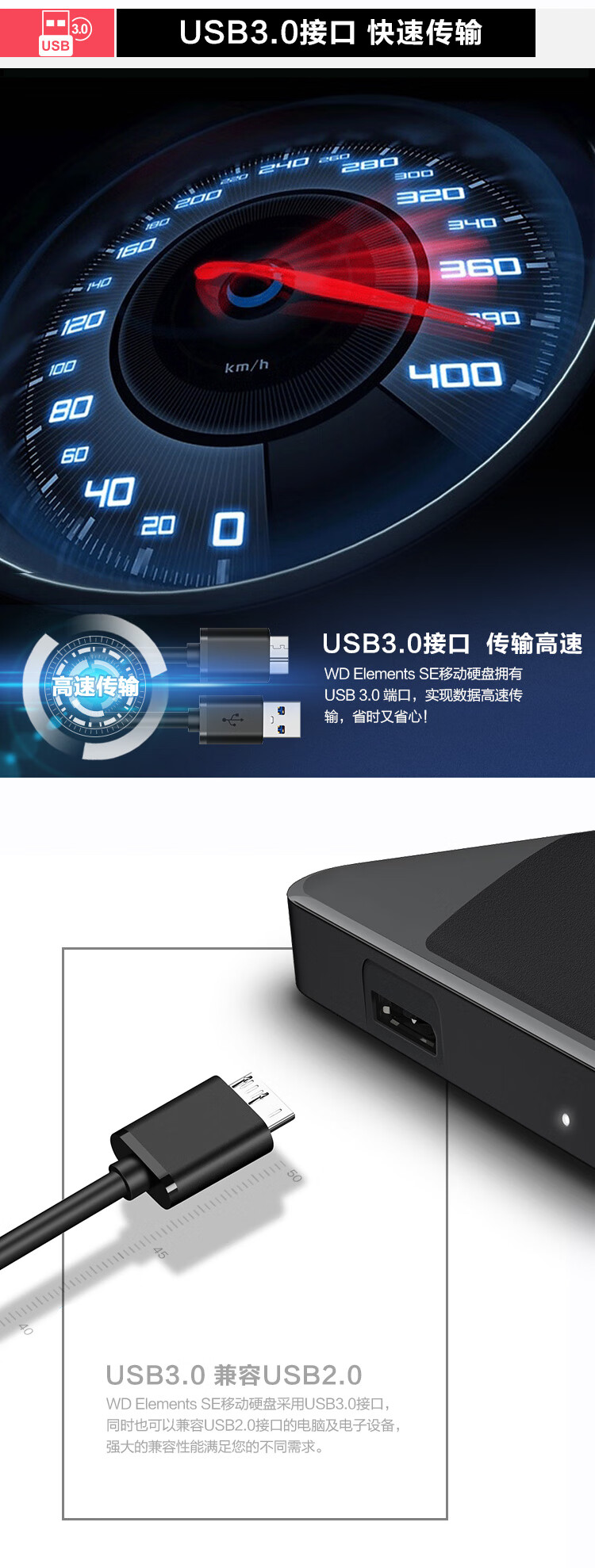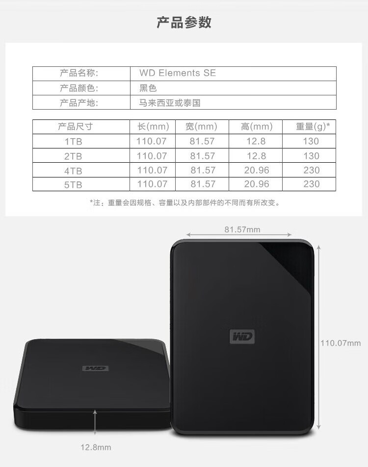 商品名称:西部数据(WD) 2TB 移动硬盘 USB3.0 Elements SE 新元素系列2.5英寸 机械硬盘 高速传输 轻薄便携 存储备份